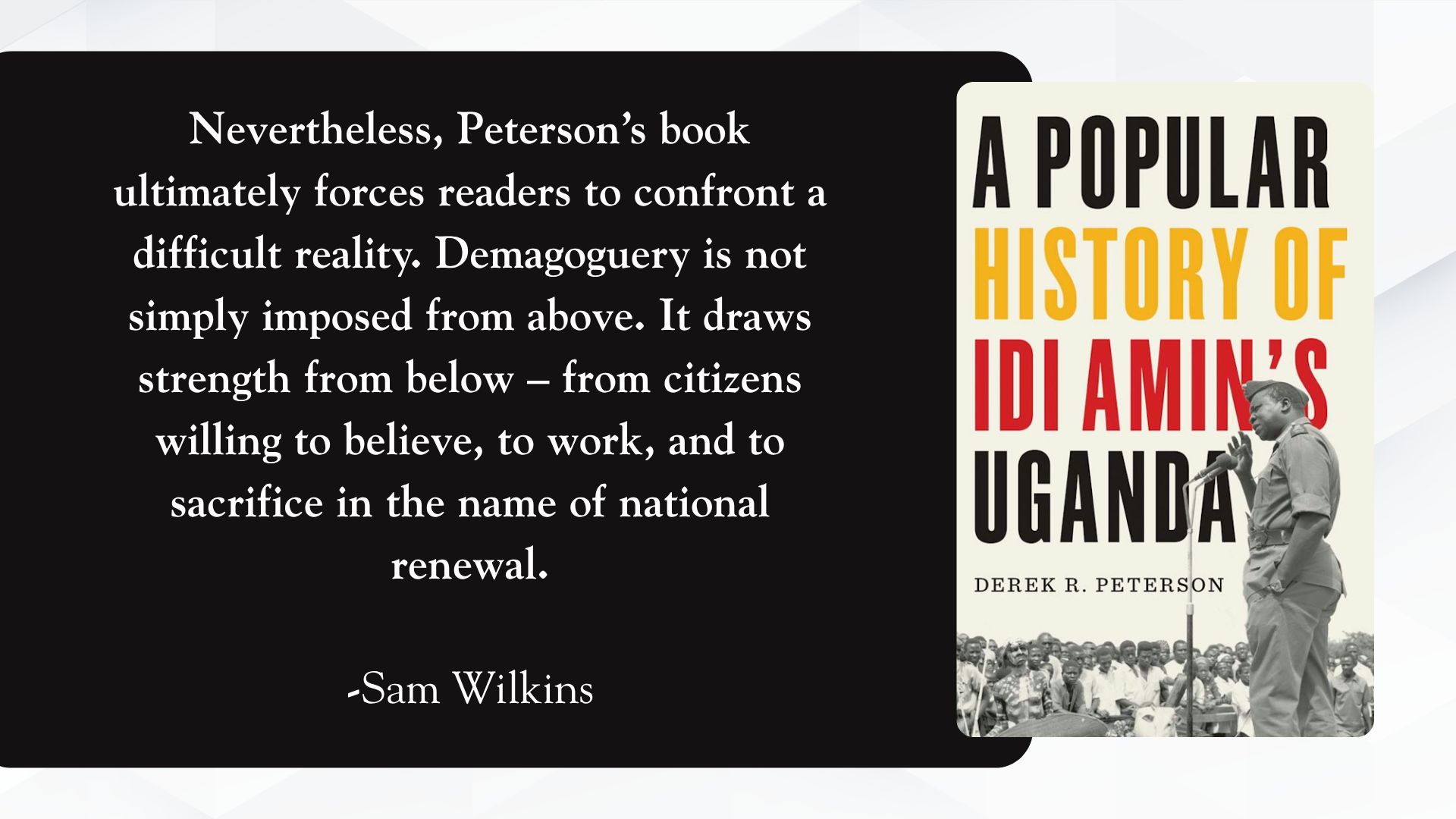 Download as PDFIdi Amin once promised to “make Uganda move once again.” The slogan never caught on like today’s political catchphrases, but the ambition feels familiar. In a moment when strongman politics is resurgent around the world, historian Derek Peterson asks a simple but unsettling question: why did so many ordinary Ugandans believe in Amin […]